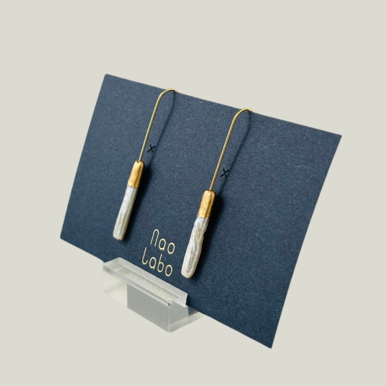 縦にすっと伸びるスティック型の淡水パールに、金粉をあしらった上品なピアス。